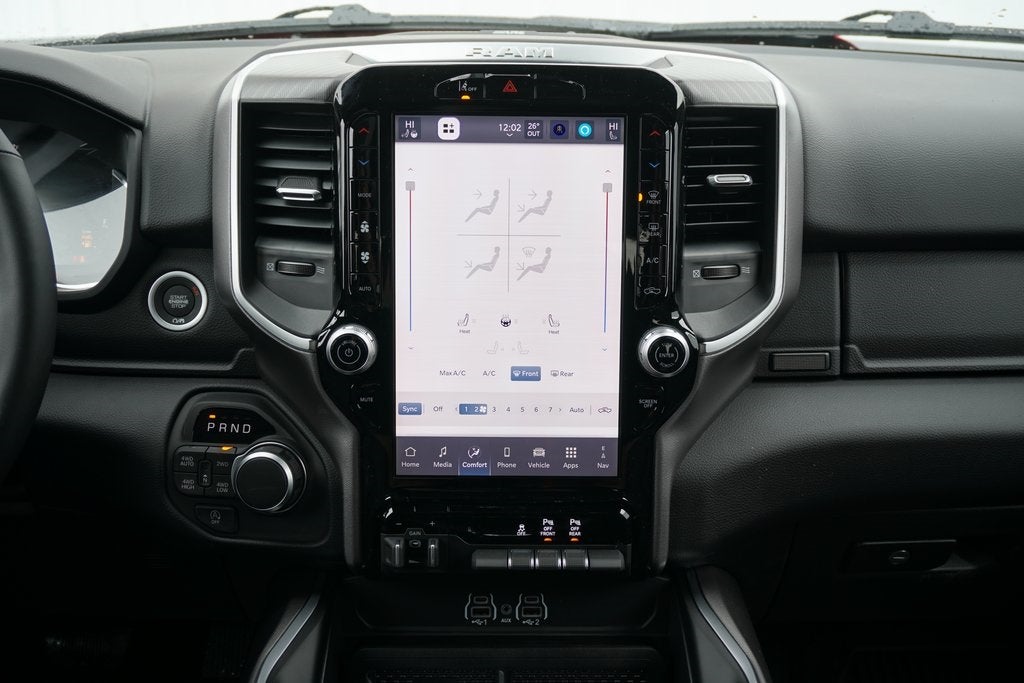 Ask about our 10 year/ 100 thousand mile free powertrain warranty offered on certain vehicles! This vehicle includes the following features : Big Horn Level 2 Equipment Group (115V Auxiliary Power Outlet, 115V Auxiliary Rear Power Outlet, 12 Touchscreen Display, 2nd Row in Floor Storage Bins, 3 Rear Seat Head Restraints, 4 Way Front Headrests, 400W Inverter, 4G LTE Wi-Fi Hot Spot, 9 Amplified Speakers with Subwoofer, Air Conditioning ATC with Dual Zone Control, Apple CarPlay, Auto Power-Folding Mirrors, Auto-Dimming Exterior Driver Mirror, Auto-Dimming Rear-View Mirror, Black Exterior Mirrors, Black Premium Power Mirrors, Body Color Fender Flares, Bucket Seats, Center Console Parts Module, Cluster 7.0 TFT Color Display, Configurable Drive Mode, Connected Travel and Traffic Services, Connectivity - US/Canada, Convex Wide-Angle Exterior Mirror Insert, Deluxe Cloth Bucket Seats, Disassociated Touchscreen Display, Exterior Mirrors Courtesy Lamps, Exterior Mirrors with Heating Element, Exterior Mirrors with Supplemental Signals, Front Seat Back Map Pockets, Full Length Floor Console, Global Telematics Box Module, Glove Box Lamp, Google Android Auto, GPS Antenna Input, GPS Navigation, HD Radio, Heated Front Seats, Heated Steering Wheel, Integrated Center Stack Radio, Integrated Voice Command with Bluetooth®, Leather Wrapped Steering Wheel, LED Dome Lamp with on/Off Switch, LED Footwell Lighting, Manual Adjust 4-Way Front Passenger Seat, Media Hub with 2 Charge Only USBs, Overhead LED Lamps, Power 2-Way Driver Lumbar Adjust, Power Adjust 8-Way Driver Seat, Power Adjustable Pedals, Premium Overhead Console, Radio: Uconnect 5 Navigation with 12.0 Display, Rear 60/40 Folding Seat, Rear Center Armrest, Rear Power Sliding Window, Rear Window Defroster, Remote Tailgate Release, Security Alarm, SiriusXM Radio Service, SiriusXM with 360L, Steering Wheel Mounted Audio Controls, Sun Visors with Illuminated Vanity Mirrors, Universal Garage Door Opener, and USB Host Flip), Night Edition (Accent Color Door Handles, Accent Color Premium Power Mirrors, Accent Color Tailgate Handle, Anti-Spin Differential Rear Axle, Black Exterior Truck Badging, Black Headlamp Bezels, Black Interior Accents, Black Painted Exterior Mirrors Caps, Black Tail Lamp Bezels, Body Color Front Bumper, Body Color Rear Bumper with Step Pads, Dual Exhaust with Black Tips, Grille Black Surround Black Mesh, RAM Grille Badge - Black, and Wheels: 20 x 9.0 Aluminum Painted Clad), Quick Order Package 27Z Big Horn, 33 Gallon Fuel Tank, 4-Wheel Disc Brakes, 48V Belt Starter Generator, 6 Speakers, ABS brakes, Air Conditioning, Alloy wheels, AM/FM radio, Apple CarPlay/Android Auto, Auto High-beam Headlights, Brake assist, Bumpers: chrome, Cloth Bucket Seats, Cluster 12 TFT Color Display, Compass, Delay-off headlights, Driver door bin, Dual front impact airbags, Dual front side impact airbags, Electronic Stability Control, Front anti-roll bar, Front Bucket Seats, Front Center Armrest w/Storage, Front fog lights, Front License Plate Bracket, Front reading lights, Front wheel independent suspension, Fully automatic headlights, Heated door mirrors, Illuminated entry, Low tire pressure warning, Manual Adjust 4-Way Driver Seat, Manual Folding Exterior Mirrors, Manufacturer's Statement of Origin, MOPAR Front and Rear Rubber Floor Mats, MyFlexCare Service Plan, Occupant sensing airbag, Outside temperature display, Overhead airbag, Overhead console, Panic alarm, ParkView Rear Back-Up Camera, Passenger door bin, Passenger vanity mirror, Power door mirrors, Power steering, Power windows, Radio data system, Radio: Uconnect 5 W with 8.4 Display, RAM Grille Badge - Chrome, Rear anti-roll bar, Rear step bumper, Remote keyless entry, Speed control, Supplier Part Tracking (J-1), Tachometer, Telescoping steering wheel, Tilt Price includes: $3500 - 2026 National Retail Consumer Cash . Exp. 03/02/2026 $500 - 2026 Great Lakes BC Truck Month Bonus Cash . Exp. 03/02/2