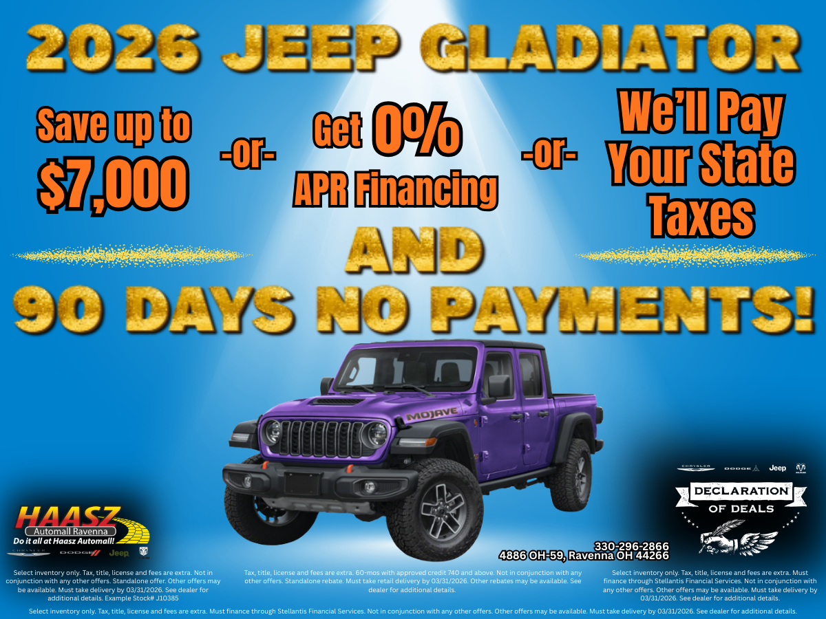 Buy a 2026 Jeep Gladiator with 0% APR - or - Save up to $7,000 - or - We'll pay your state tax!