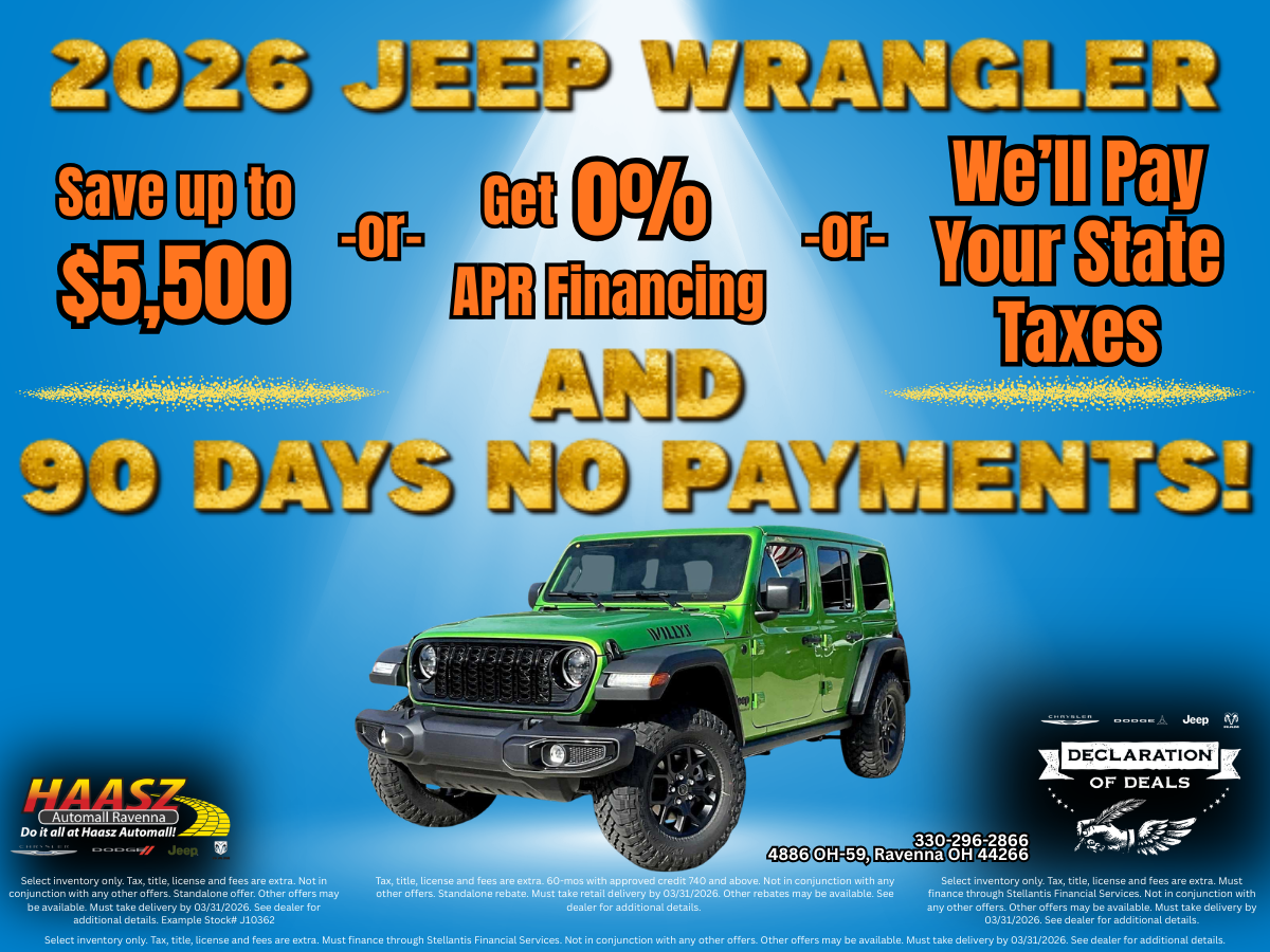 Buy a 2026 Jeep Wrangler with 0% APR - or - Save up to $5,500 - or - We'll pay your state tax!