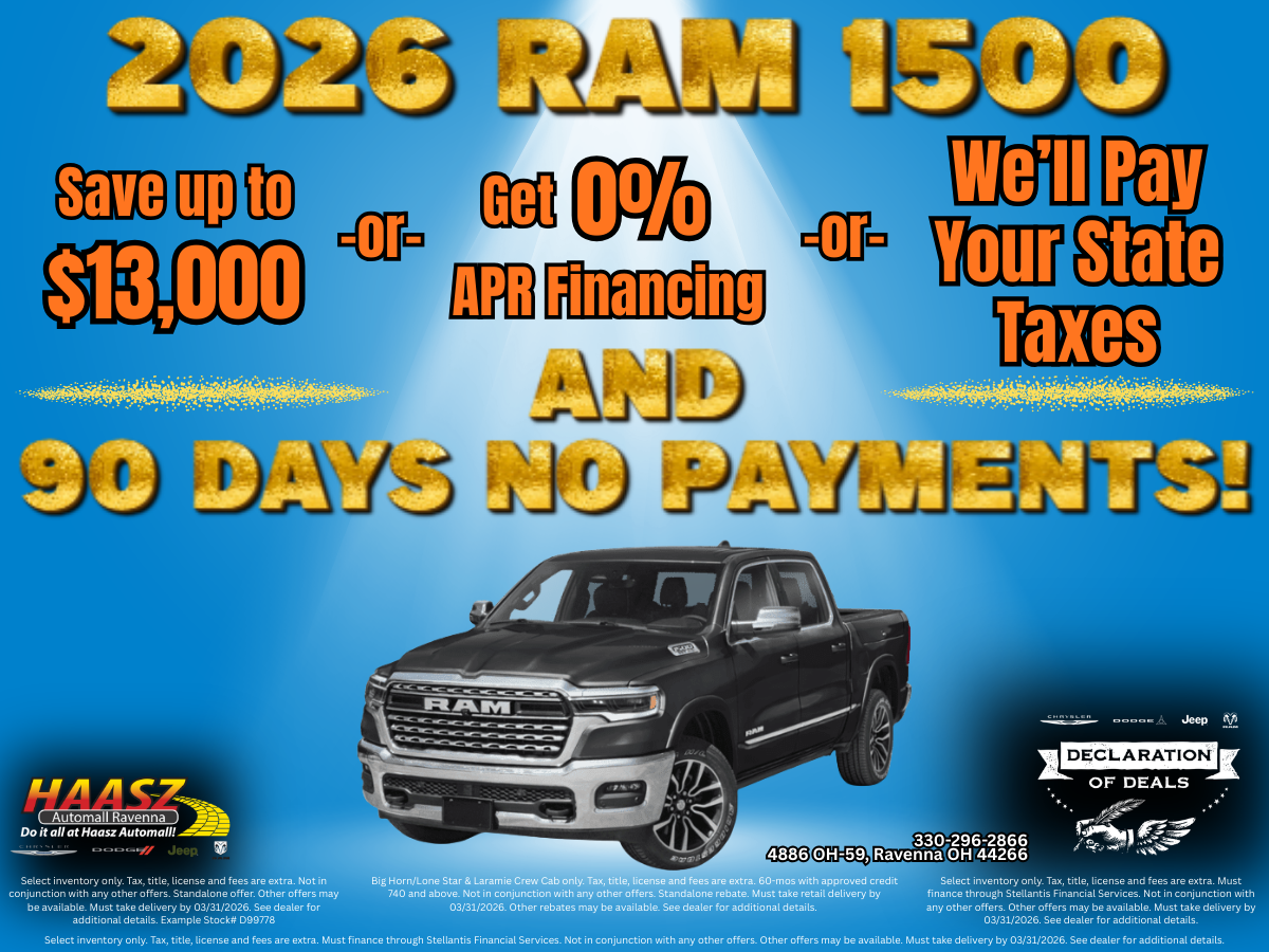 APR: Big Horn/Lone Star & Laramie Crew Cab only. Tax, title, license and fees are extra. 60-mos with approved credit 740 and above. Not in conjunction with any other offers. Standalone rebate. Must take retail delivery by 03/31/2026. Other rebates may be available. See dealer for additional details. Savings: Select inventory only. Tax, title, license and fees are extra. Not in conjunction with any other offers. Standalone offer. Other offers may be available. Must take delivery by 03/31/2026. See dealer for additional details. Example Stock# D99778 Taxes: Select inventory only. Tax, title, license and fees are extra. Must finance through Stellantis Financial Services. Not in conjunction with any other offers. Other offers may be available. Must take delivery by 03/31/2026. See dealer for additional details. NoPayments: Select inventory only. Tax, title, license and fees are extra. Must finance through Stellantis Financial Services. Not in conjunction with any other offers. Other offers may be available. Must take delivery by 03/31/2026. See dealer for additional details.