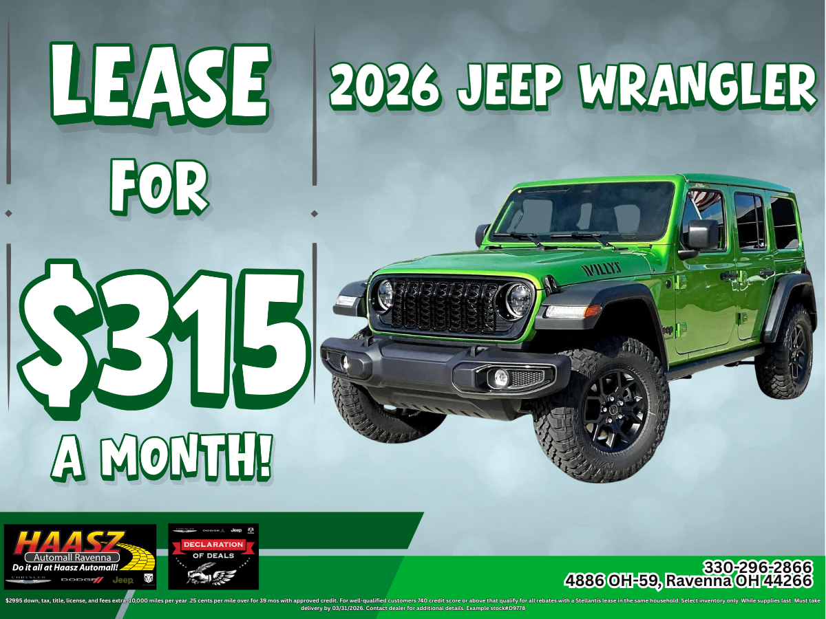 $2995 down, tax, title, license, and fees extra. 10,000 miles per year .25 cents per mile over for 36 mos with approved credit. For well-qualified customers 740 credit score or above that qualify for all rebates with a Stellantis lease in the same household. Select inventory only. While supplies last. Must take delivery by 03/31/2026. Contact dealer for additional details. Example stock#J10362