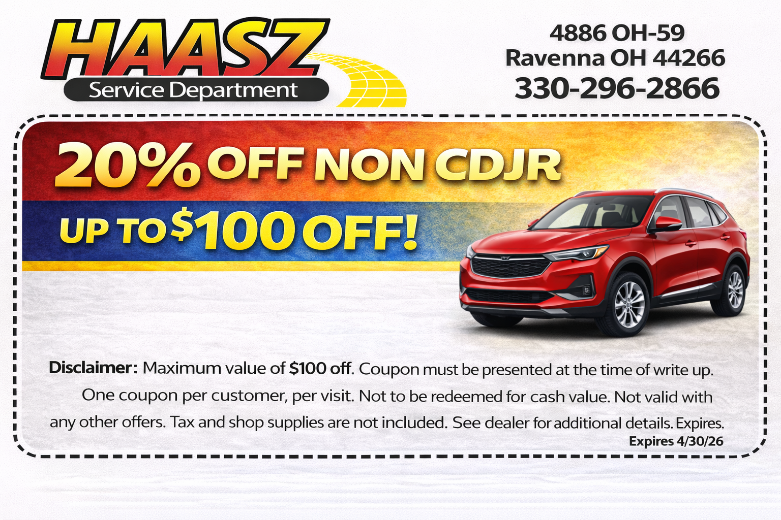 Disclaimer: Maximum value of $100 off. Coupon must be presented at the time of write up. One coupon per customer, per visit. Not to be redeemed for cash value. Not valid with any other offers. Tax and shop supplies are not included. See dealer for additional details. Expires 4/30/26