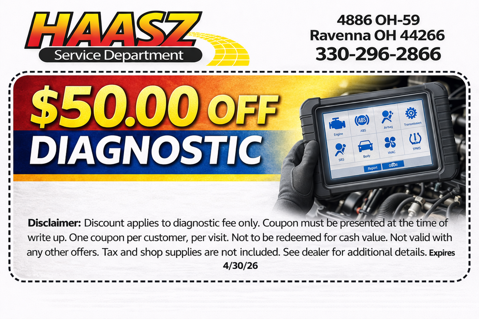 Disclaimer: Discount applies to diagnostic fee only. Coupon must be presented at the time of write up. One coupon per customer, per visit. Not to be redeemed for cash value. Not valid with any other offers. Tax and shop supplies are not included. See dealer for additional details. Expires 4/30/26